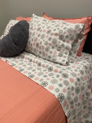 [This review was collected as part of a promotion.] I received this sheet set as a sample to try and i love them. They are so soft and keep me warm during these Nebraska cold nights. The design on them is very cute also its light pink and grey snowflakes. The pockets on the fitted sheet fit the bed perfectly they don’t slide up at all. I’d definitely buy more of these sheets especially during winter.