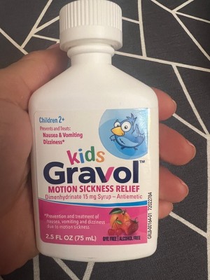 GRAVOL kids liquid is used for the prevention and treatment of motion sickness; relieves nausea, vomiting and dizziness. GRAVOL Kids Liquid is dye-free and alcohol-free with a great tasting fruit flavor that is easier for children to take.​