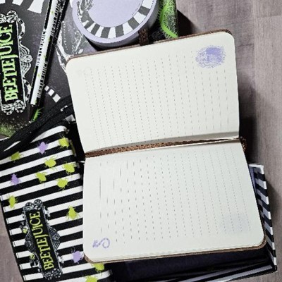 Just received this beautifully made Beetlejuice Stationery Set. The coffin box is nicely designed and very sturdy. The notebook cover is very detailed, love it (pocket size). It also has a sticky note set, enamel charm bookmark, pencil pouch, and a pen. I would recommend this as a gift or for yourself. (Attaching pics, looks like they are being uploaded sideways).