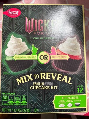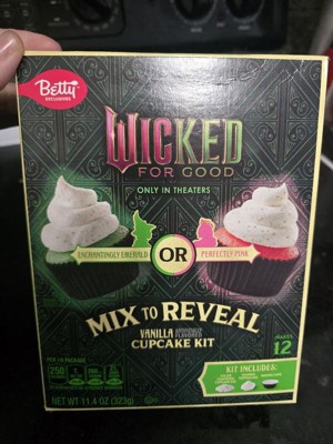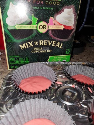 [This review was collected as part of a promotion.] I got these for a fun treat for my family who love cupcakes and Wicked. The color revel was a fun touch! The cupcakes are vanilla flavored and seemed to have a more artificial smell and tatse than I'm used too. I do like that it came with a frosting mix also.
