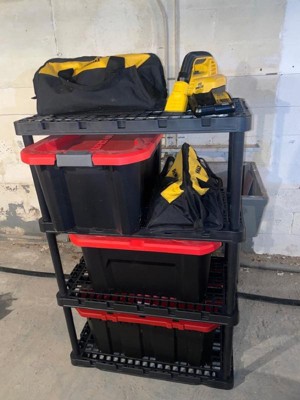[This review was collected as part of a promotion.] First, this shelf was easy to put together. It is made of thick plastic and is super sturdy. It doesn't lean or sink when you add stuff to it. This shelf is also the perfect size for my storage bins. My bins can be heavy but you would never know that looking at them on these shelves. These look so much better than my metal ones. I am going to buy more of these for my garage!