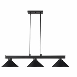 Straight line inspired detailing defines this beautiful three light fixture. Finished in matte black and paired with metal brushed nickel shades, this three light fixture would be equally at home in the game room, or anywhere else in the house needing a touch of modern charm. Adjustable rods are included to ensure the perfect hanging height. Room Recommendation: Game Room/Dining Room/Kitchen/Kitchenette Rod Length(s): 2-3, 2-6, 6-12 Dimmable: Yes Shade Included: Yes