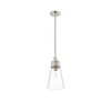 A slender silhouette forms enticingly clean lines that enhance the sophisticated look of the Wentworth single-light mini pendant. Bring targeted lighting to a nook or reading space with this elegant fixture fashioned of brushed nickel finish metal and a conical clear glass shade. An ideal choice for custom spaces, this pendant adds a signature design stamp to define personal taste. Cord Length: 110.00 Rod Length(s): 1-3, 1-6, 6-12 Dimmable: Yes Shade Included: Yes