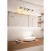 Straight lines and chic angles create a compelling, Zen-inspired silhouette for this modern four-light bathroom vanity wall light. From the Lauren collection, the sconce boasts a clean, straight bar hosting a quartet of clear glass shades that may be mounted up or down. Their flared design perfectly emphasizes the soothing style of a contemporary fixture that's beautifully accentuated with a sleek brushed nickel finish.