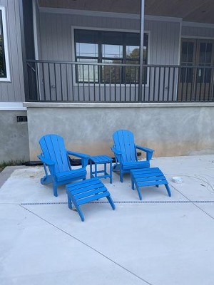 Make your backyard into an oasis with this amazing 5-piece patio set. Each piece in the set is made of a durable weather resistant HDPE material that is made to last each season. Sit in comfort with classic Adirondack chairs that feature a wide armrest, a wide contoured seat, and a waterfall front that flows with the shape of the back of your knees for the most comfortable seat. Get more out of the chairs with the ottomans to rest your feet on and fall into a deep state of relaxation. Each piece has a UV resistant finish to protect the set from the harsh UV rays and has fade-resistant colors to keep those beautiful colors all season long. This is the perfect set to add some color and comfort to your backyard.