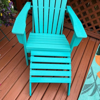 Sit back, relax, and catch a tan or enjoy some family time on this stunningly crafted 2-piece Adirondack chair with ottoman set. Designed with comfort and style in mind, it features an ottoman for your feet and a broad armrest for extra armroom; a seashell design and curved reclined backrest for a more comfortable seat; and a high back for superior back support that lessens spinal tension. Constructed from a durable and solid HDPE material that is weather resistant and, unlike wood, won't rot, crack, chip, peel, or splinter. A UV-protective coating prevents fading, keeping the colors vibrant and amazing all year long. These attractive chairs are easy to clean, making it perfect for the outdoor space and is sure to make your backyard the place to be.