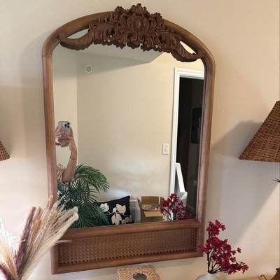 Dovelina Wood Frame Arched Top with Carving Decorative Wall Mirror Bottom with Rattan Hanging Mirror - 36"x24",Natural Wood