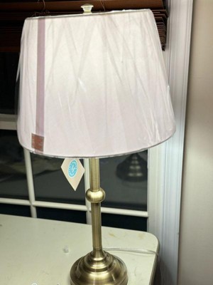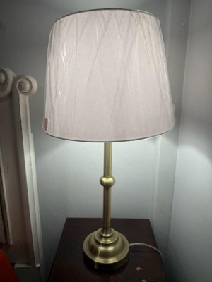 Add a touch of elegance to your living space with this beautiful Aelorian table lamp from the Bedford collection by Hampton Hill. This classic lamp features an antique brass finish and an empire fabric shade in off-white color. The on/off rotary switch is on socket and the lamp plugs in, so it's easy to operate. The 60" clear colored cord is polarized for safety.