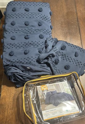 [This review was collected as part of a promotion.] Lucy Clip Jacquard Duvet Cover Set has a nice design. It has little puffy and fluffy tassel like parts that give it that cozy feel. I also love the color you can't go wrong with navy blue. It was easy to put a comforter inside all I did was unbutton it and flipped the the duvet in side out . It has little ties inside to keep the corners of a comforter inside. The texture of the duvet and pillowcases are smooth almost like silk but not quite as it's a bit more matte. Over all I like it.
