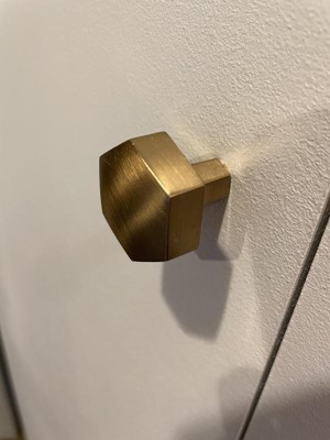 [This review was collected as part of a promotion.] It was a good size knob and the geometric shape is unique, but the heft and the finish of these knobs almost felt like they were meant to be used in a workshop or for an industrial or commercial application. It has a cast iron finish/feel to it that wasn’t appropriate for our kitchen cabinets.