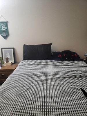 [This review was collected as part of a promotion.] This blanket is not only stunning, but it’s soft and cozy! The twin size was sent to me and it’s the perfect size for a twin bed (obviously), but also perfect for cuddling up on the couch! Praying this blanket holds up after washing because I LOVE IT! Also, super cute with one side being boxes and the other side stripes! I’m obsessed!