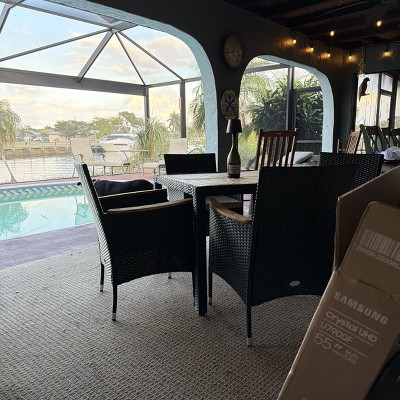 We are very happy with our purchase. The table is very sturdy and looks great. It was easy to assemble as well. Definitely a great addition to your outdoor entertaining area! And are very happy with the quality and price of this set, especially the comfort of the chairs. Unlike a lot of patio furniture, the backrest height of each chair is perfect for support. The cushions are not deep but have enough cushioning and there are no stains. Definitely worth the purchase.