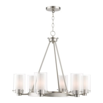 Collection: Pennington, Material: Steel, Finish Color: Brushed Nickel, Width: 28", Height: 24", Hanging Method: Chain, Chain Length: 36", Lamping Type: Incandescent, Number Of Bulbs: 6, Wattage: 360 Watts, Moisture Rating: Dry Rated, Desc: This intricately accented and masterfully forged six light chandelier is from the Pennington collection. Finish is an antique brass and features include gracefully sculpted arms and with sparkling clear crystal.,