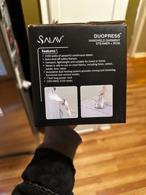 The SALAV HS-100 DuoPress Hand Held Steamer + Iron is a powerful 1150 watt garment steamer and Iron in one built with the latest dual heating technology. The dual heating technology combines the wrinkle release power of a garment steamer with the pressing power of a ceramic coated ironing plate. Reaching temperatures of over 300 degrees Fahrenheit the HS-100 will press and straighten event the toughest wrinkles. Great for use on most garments or around the house. The Ironing Mode heats the ironing plate to produce a dry iron, similar to a traditional iron. Steaming mode releases powerful steam and heats up the ironing plate which can be used horizontally as a steam iron or vertically as a handheld garment steam