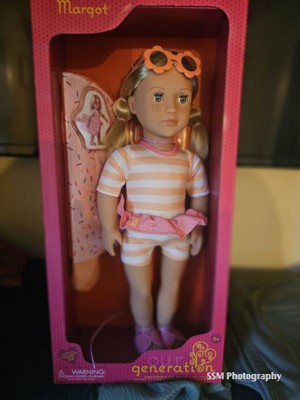 [This review was collected as part of a promotion.] The Our Generation Margot doll is simply adorable. She has blonde hair and blue eyes. She is ready for the pool or beach. She is wearing a swimsuit and has matching flower sunglasses, and matching sandals. She has a pool float in the shape of an ice cream bar. Her body is soft and her head, arms and legs are move able. She is very cute and age appropriate.