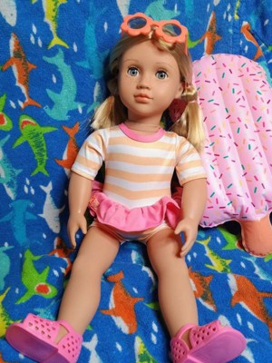 Explore beach day waves and vacay adventures with Our Generation 18-inch doll Margot! Dressed for fun in the sun, she wears a striped swimsuit with a pink frilly waist, peep-toe sandals with mini heart cutouts, and floral sunglasses that add a splash of cuteness. Plus, Margot comes with a pink popsicle-themed pool float that inspires pretend swimming and sweet storytelling. It features a rainbow sprinkle print and even inflates like a real floatie! Margot has lifelike details that will delight doll fans during playtime, from her adorable freckles and brushable blonde hair to her beautiful blue eyes that open and close. And for kids who love dress-up, her outfit has easy-open closures to quickly put on and remove. So they can mix, match, and create more fun looks! Our Generation dolls make a great gift for kids ages 3 years old and up (small parts), encouraging them to imagine their own unique stories.