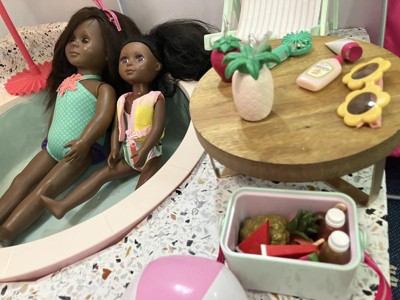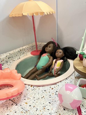 So adorable. We love this pool At Taylor’s Dollhouse. It’s begin enough to fit 2 dolls but we have eight dolls so we made a little addition with all the new OG pool accessories.