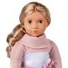 This Our Generation girl doll is very cute with wavy blonde hair, brown eyes, light pink colored lips and light skin tone. I bought mine for $20 and she was worth the wait. personally I am not a fan of the very small sweater that doesn't function as such and when you lift the arms a little it stretches out the top sweater piece, coming off very easily. Other than that this doll is the right choice for doll loves and especially if they live dancing.