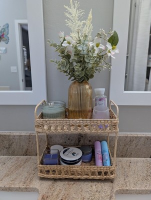 This two tier shelf is so cute, I love the visual appeal it adds to my bathroom. It's not huge so it doesn't take up my whole counter top but it can fit a lot of my products on its two shelves. The woven, neutral color looks cute in any space and I have all my skincare and makeup stacked on it.
