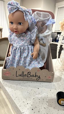 [This review was collected as part of a promotion.] The LullaBaby 14" doll is dressed in an adorable blue floral dress with matching bottoms and a bow headband, as well as a cozy blue-and-white pajama set. It comes with a sippy cup, lid, and teether, all designed to fit into the doll's mouth for realistic role-play. The outfits are designed with easy-open closures, allowing young children to quickly change the doll's clothes.