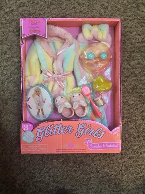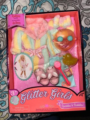 [This review was collected as part of a promotion.] My daughter loved the Glitter Girls Sparkles & Bubbles set. The robe is very soft. There's a bath brush, duckie, towel, and headband. This will be a staple with her doll collection