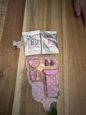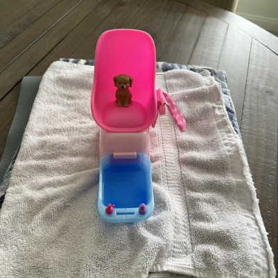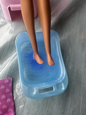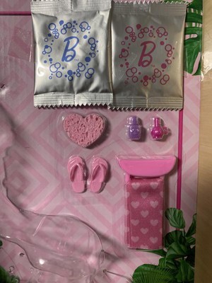 [This review was collected as part of a promotion.] This mini pedi and spa Barbie set is all you need to have a phenomenal time playing Barbie spa day. It comes with a small heart shape sponge, a pair of flip-flops, a towel and towel holder, a puppy and to make it a real experience it also has a blue and pink water powder. Excellent Barbie set.