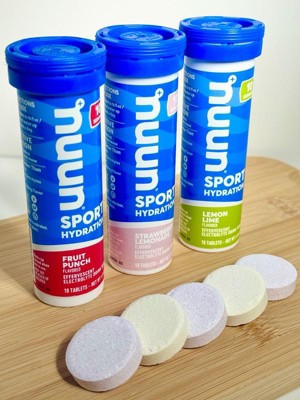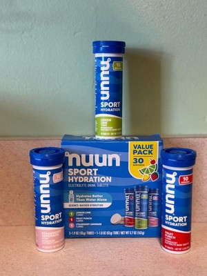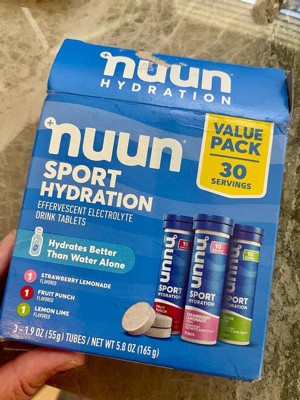 Nuun Sport is made for workout hydration with five essential electrolytes to help replace what your body loses through sweat. Made for pro-active hydration, this effervescent electrolyte tablet hydrates better than water alone and is perfect for use before, during and after your workout. Nuun is clean hydration† that champions all movers – from yogis to marathoners. With crisp, refreshing flavors and 1 gram of sugar per serving, Nuun Sport is a great choice for your active lifestyle. Simply add an electrolyte tablet to 16 fl oz. water, wait for it to dissolve and enjoy! Each value pack contains one tube each of Strawberry Lemonade, Fruit Punch and Lemon Lime flavors for a total of 30 servings (10 per tube). †Clean is defined as all products being non-GMO, vegan and gluten free.