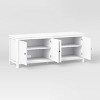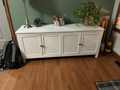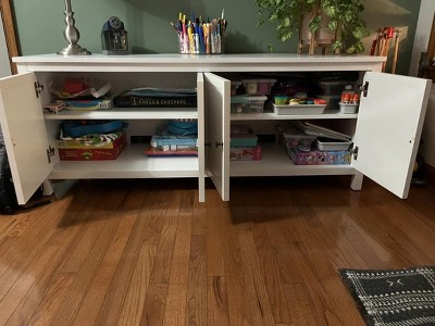 A: The TV stand features two double-door cabinets with shelves for storage.