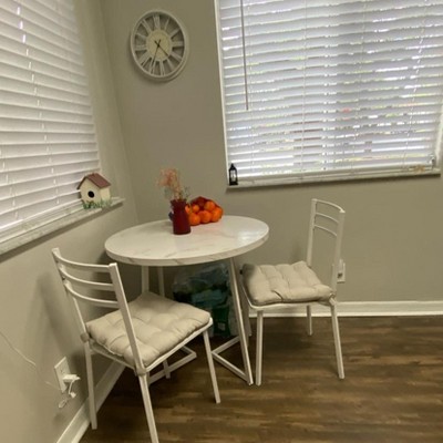 It is like the photos, good for the price, for spaces like the kitchen, pretty and easy to assemble, I bought cushions for the chairs for more comfort.