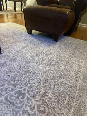 Elevate any space with the ornate design of this Persian-inspired rug from the Eco Cycle Collection. The elegant floral pattern is made with the environment in mind, using recycled fibers that are tough enough to stand up to life’s messes, yet soft enough to bring comfort to hard floors. This vintage-style rug is presented in a silver-grey tone that easily complements a variety of styles. Pair with eclectic furniture and add vibrant pillows and throws in a boho themed room, or place in a minimalist room to anchor the space without overwhelming.