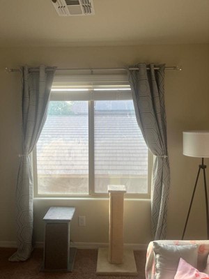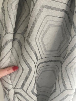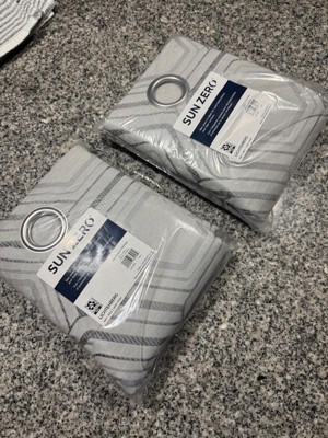 Featuring a unique geometric pattern, Sun Zero Brevick Curtain Panels adds style and dimension to any living space. Equipped with grommets for easy hanging on standard curtain rods up to 1.5" in diameter. Sun Zero Total Blackout Thermal Lining is laboratory tested to block out 100% of light, reduce outside noise by up to 40%, and decrease energy lost through your windows by up to 40%. Comfort is optimized with thermal properties that help keep summer heat and winter chill out of your home. Hang in your entertainment room to eliminate screen glare and reduce distracting outside noise, or in your bedroom for enhanced privacy and a sounder, more uninterrupted sleep. Mount rods at least 2" above the window for maximum light blocking. Sold as individual panels measuring 40" width by 63" length in color steel gray. Measure carefully before selecting your desired size and quantity. Rod not included. Machine wash cold on gentle cycle. Use non-chlorine bleach when needed. Tumble dry on low heat, using a cool iron as needed.