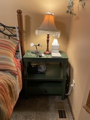 This night stand is a perfect size. The open shelves make it great for placing a c-pap machine a bit less conspicuously. You still have a drawer for essentials and plenty of room on top, plus the pull out for extra space. Assembly was very easy.