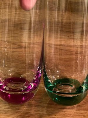[This review was collected as part of a promotion.] These glasses are so pretty, especially when they are filled with champagne. I like the colors on the bottom, and there are different colors, so you don't have to worry about getting your drink mixed with others. They are easy to clean, and their slim looks make them easy to store, too.