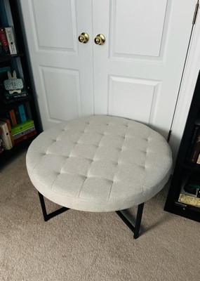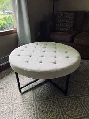 Emma and Oliver 34 in. Cotton Linen Round Ottoman with Tufted Design and Sturdy Iron Frame