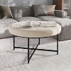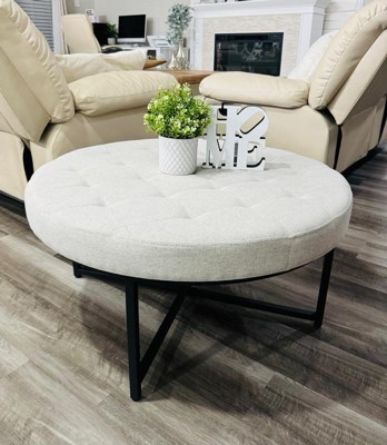 Product Name: Emma and Oliver 34 in. Cotton Linen Round Ottoman with Tufted Design and Sturdy Iron Frame, Beige Linen/Black Frame