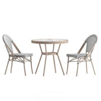 Product Name: Emma & Oliver Massalia Indoor/Outdoor Bistro Style 31.5 in. Table with Black & White Textilene, Glass Top, and Two Chairs - Light Natural Frame