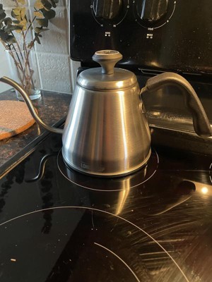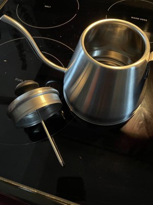 We love this tea kettle! My son uses this daily for his "Green Tea". Has a handy temperature thermometer built into the top knob so he make sure his tea isn't too hot or cold! The handle does get so hot (great feature). Pours to perfection without ANY splashes or spills. I never knew my family needed this product until trying it.