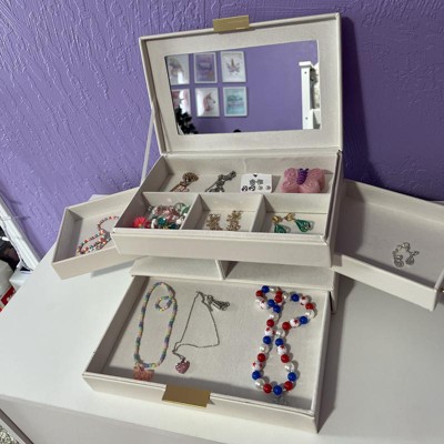 [This review was collected as part of a promotion.] My daughter was super excited to get this jewelry box for Christmas. It fits all of her jewelry in there, and she’s reminding me that there’s still room for more! I love the sturdiness of the jewelry box and the compartments and drawers that can easily slide out. The one thing that makes it awkward is that the two side drawers don’t fan all the way out- it’s at more of an angle, but does not pull all the way out. The bottom drawer has a safety feature where it does not pull all the way out, which is good. The interior has a velvet feel, and the exterior has a faux leather texture. I received an incentive to write this review.