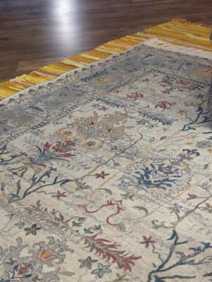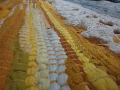 It is a beautiful rug that is well worth the price. The yellow has a mixture of darker and lighter yellows along with some more orange and almost greenish strands mixed in. It does seem like it's a bit delicate so maybe not best for very high traffic areas or house holds with children or messy pets.