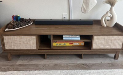 Immerse yourself in mid-century modern charm with this stylish TV stand featuring unique woven doors that add artistic elegance to your decoration. With large storage space and smooth sliding doors, this entertainment center offers both functionality and aesthetic appeal. The adjustable shelf is 3-position available for different sized items. Built for stability with 6 support legs and non-slip foot pads, it ensures your electronics are securely held. Say goodbye to cable clutter with integrated management holes, creating a tidy and relaxing entertainment space for your viewing pleasure.