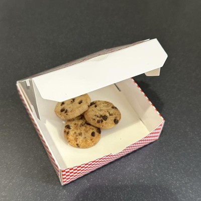 It’s a strange size a bit too big for a cookie and too small for most other treats such as a Madeline or muffin. I am not sure what we could use these for. The boxes are made of thin cardboard like paper and require nimble fingers to assemble. Also a bit disappointed that all the boxes are the same mono color red white design which does not feel especial fun or pretty. It also says the word pizza on each treat box. I received an incentive to write this review.