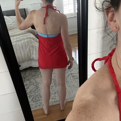 Swim cover-up mini dress from Wild Fable™. Made from breathable recycled polyester terry fabric with spandex for a soft feel and stretchy comfort. Designed with a halter neck with a behind-neck tie. Mini length is perfect for wearing over a variety of swimsuits.
