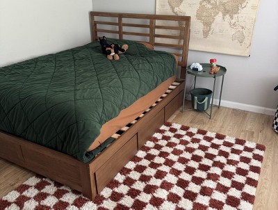 This rug is way softer than I expected—super cozy, not itchy at all, and comfortable enough to lay on without feeling like you’re on weird plastic fuzz. It’s not thick like a tufted rug, but it’s got that perfect shaggy texture that makes the space feel warm and with personality. The color matched the photos really well and gave my room the exact pop of personality I was going for. It doesn’t shed and it stays in place—no annoying rug slipping happening here. The only thing I’d flag is the chemical smell when it first comes out of the packaging. I’d recommend airing it out or giving it a light shampoo before putting it in a closed-off space. Once that fades, it’s perfect. Definitely recommend if you want something fun, soft, and vibe-boosting.