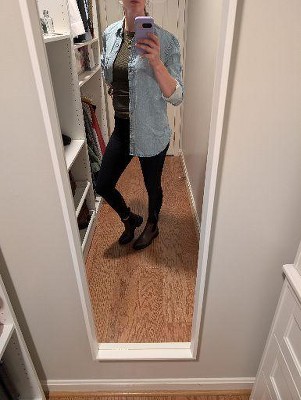 I joke that this is my emotional support denim jacket/shirt. I love it and feel so cozy in it. Im typically a small/medium in most target tops and have broader shoulders, but ordered a small and am super comfy in it. 10/10!