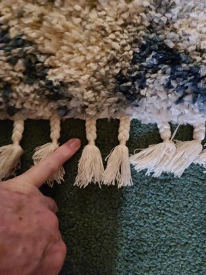 This is a very nice area rug. This is a shag rug and feels good. Kids like the texture. The materials are very good and the feel is soft and firm. The color is in the yarn and seems color fast. There are tassels on the ends that are about 2 inches long. They are braided and substantial. The pile of the carpet is about 1 ½ inch. It has a nice weave of the different colors and they all have the same feel of texture. The shipping tight roll needs some time to relax, but is fine after some rest. This is a sturdy rug.