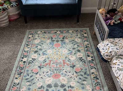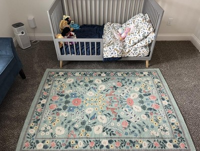 Get it! It’s so beautiful and great quality. It has the same look as Rifle Paper, but for a fraction of the cost. Not overly soft, but not scratchy. Heavy enough that it doesn’t move around and bunch up on the carpet and vacuums well! The mint color matches so well with other items in the cloud island/pillow fort brands!