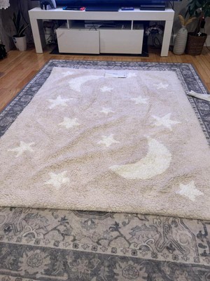 • A: The area rug features a charming celestial theme with prints of moons and stars.