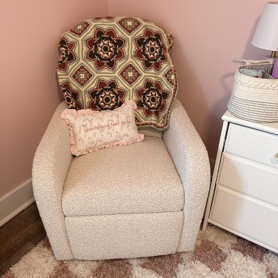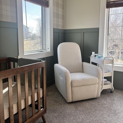 Amazing recliner! Added to my nursery and it’s not only comfy, but my short legs can touch the ground enough to be able to rock my baby comfortably! Great material, easy to set up