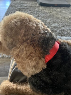 This red collar looks great on my Airedale Terrier. He is darker in color so most collars don’t show. It’s cherry red, very thick and very durable. It adjusts easily and has a ring to put a tag if needed. My dog seems to be comfortable in it.