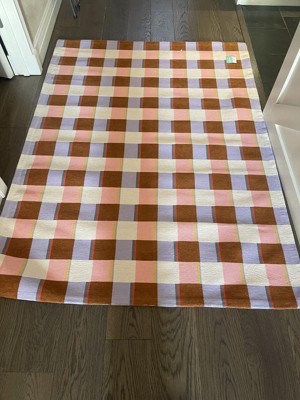 This rug has a fun unique mix of colors. I love plaid printed rugs. I like how the colors contrast while keeping the overall pink theme. It’s perfect for the kids play area. It’s got some good weight to it and is nice and durable. It is low-pile height and the backing is cotton. Rectangle shaped and measures 5’ x 7’. Overall it is very well made and happy with it. Thank you!